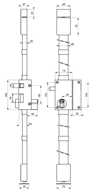 Options : Kit de tringles pour une hauteur maximum de porte de 3,00m. Points de verrouillage complémentaires. Selon modèle, cylindre profilé fourni : T6 30 x 65 mm pour porte de 45 mm maxi.