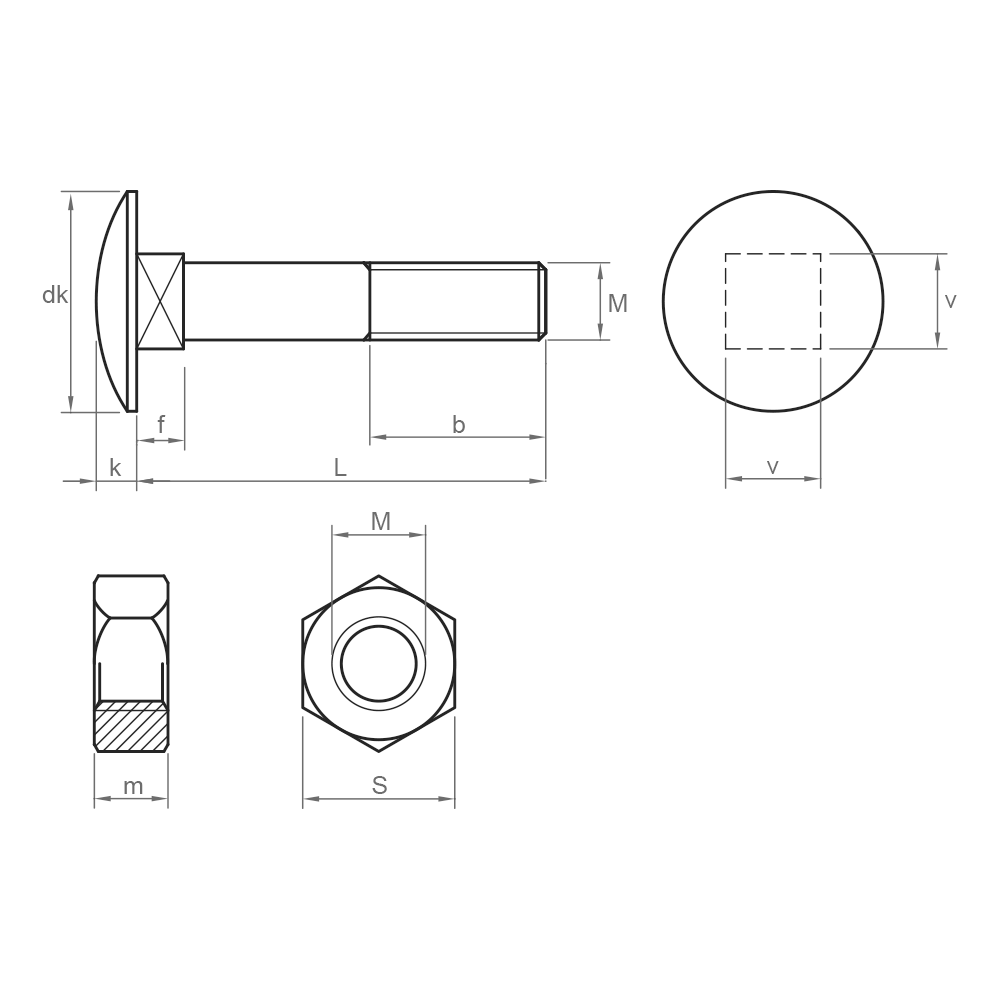 Il s’agit d’un boulon à faible résistance avec équivalence ISO 8677 et d’un écrou hexagonal avec équivalence ISO 4032, zingué. Il a une tête ronde avec un col carré et un filetage partiel. Il est utilisé dans les projets de construction, de charpenterie et d’assemblage.
