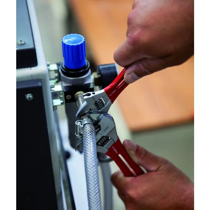 Mâchoire à grande ouverture qui lui permet de remplacer deux clés (6“-8“ pour la référence 017020, 8“-10“ pour la référence 017021, etc…)