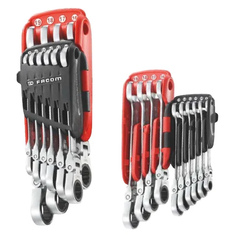 • Jeu de 8 clés mixtes articulées à cliquet en pouces sur étui portatif.