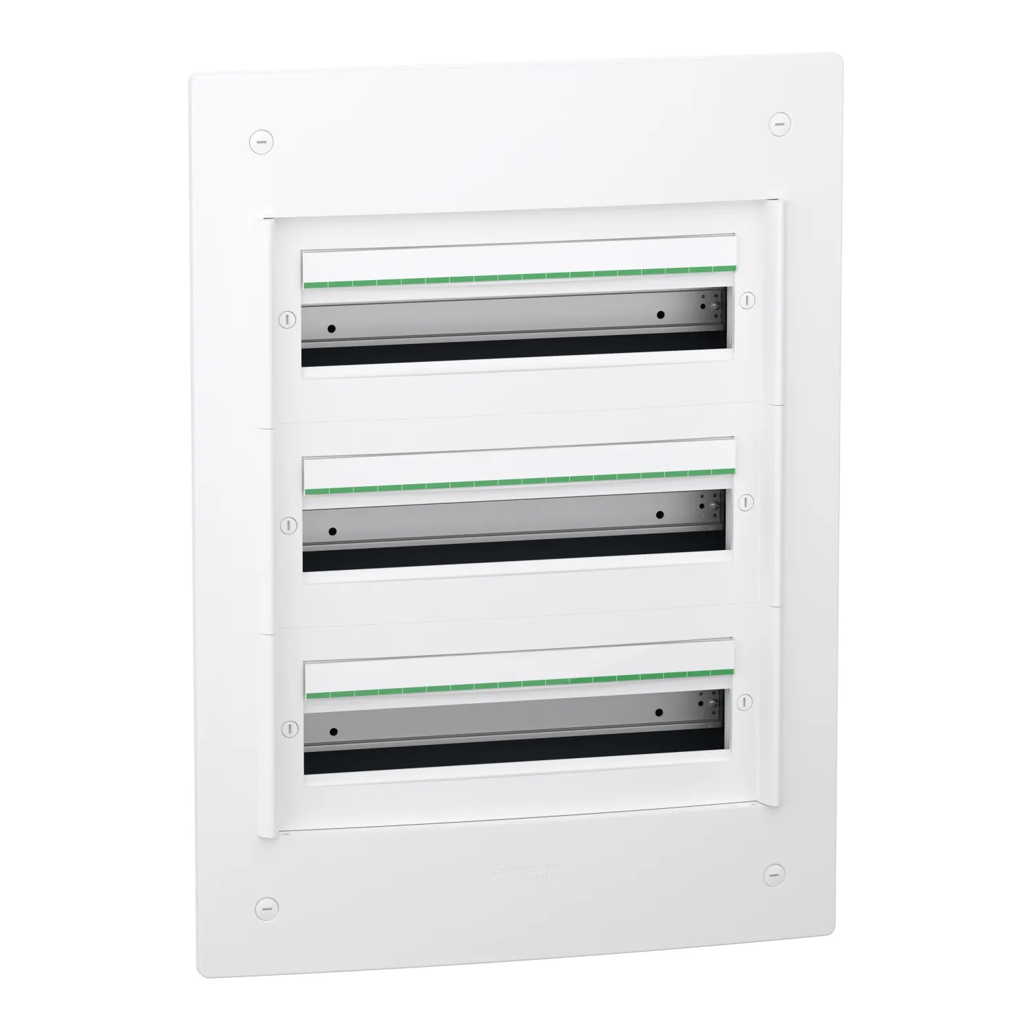 Ce coffret PrismaSeT XS est un coffret de distribution électrique encastrable, en plastique, composé de 3 rangées de 18 modules de 18mm, avec des degrés de protection IP30 et IK08 sans porte. Il peut accueillir tous types d’appareillages modulaires. Compatibles avec nos produits embrochables (XE), ce coffret est dédié à une installation en intérieur et est destiné aux secteurs résidentiel et tertiaire. Le coffret, le plastron et la porte de couleur blanche (RAL 9003) rendent plus esthétique vos équipements. La classe d’isolation électrique est de classe II.