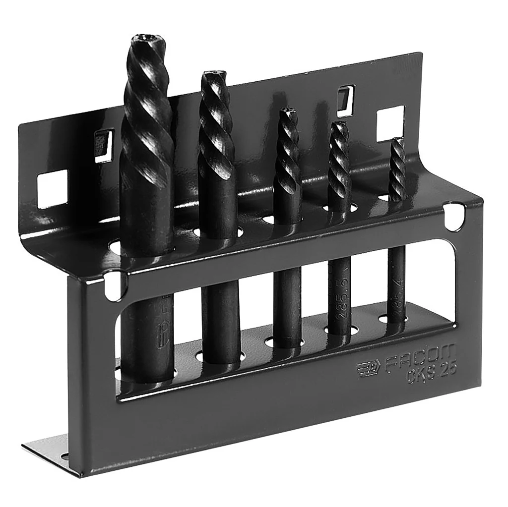 •285.J10 : Jeu de 5 extracteurs de goujons + 5 forets coniques adaptés et un tourne à gauche Réf 831.1 (utilisation avec les...