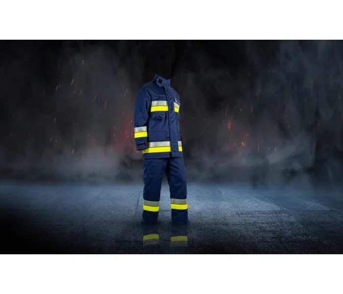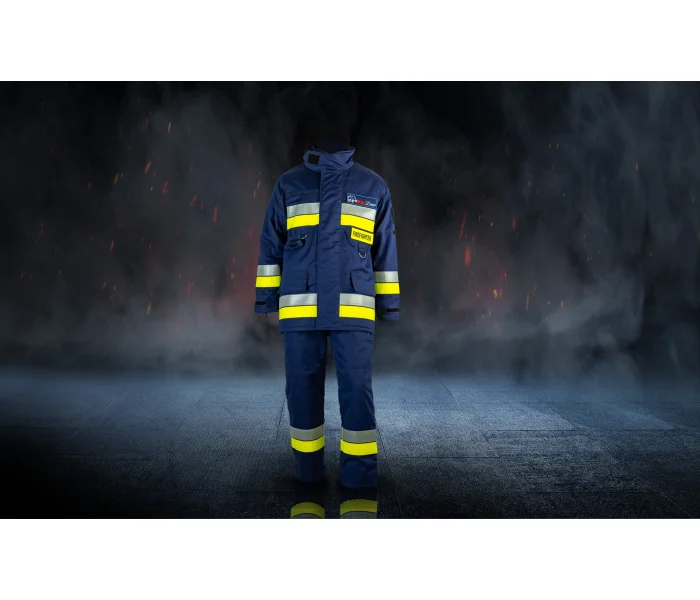 Le modèle spécial de vêtements de pompier BDUSP 2-2 est construit à trois couches – la couche externe, la doublure thermoîdifiante détachable, la barrière d’humidité avec une doublure intérieure avec un point de diamant. Une tenue BDUSP 2-2 complète se compose d’une veste et d’un pantalon de trois quarts de longueur. Il porte des bandes fluorescentes argentées et jaunes et présente des panneaux indiquant «FIREMAN» (dans le langage de l’utilisateur) fabriqués par une méthode d’impression thermique ou avec des bandes de velcro à l’avant et à l’arrière de la veste.