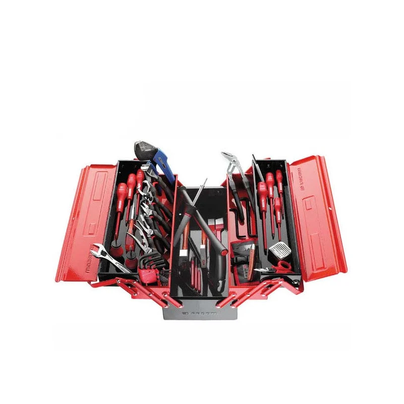 Boîte d’outillage métrique de 50 outils comprenant : 6 clés plates de 3 2 à, 13 mm en trousse 1 clé à, molette 4 tournevis électricien à, lames gainées de 3 5 – 4 – 5 5 – 6 5 mm 2 tournevis électricien Phillips n°, 1 et 2.