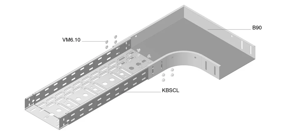 Accessoire en acier pré-galvanisé pour chemins de câbles, permettant un changement de direction à angle droit. Conception robuste et installation rapide, compatible avec les systèmes Vergokan.