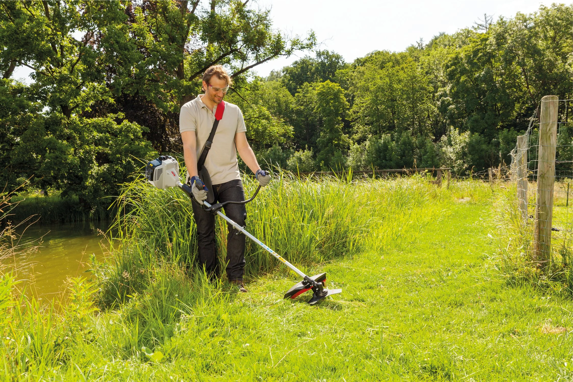 Avec son moteur 2 temps 0,9 kW de dernière génération doté d’un démarrage facile, vous disposez d’une débroussailleuse performante. Elle offre une utilisation confortable et sûre aux débutants et aux amateurs de jardinage. Vous venez à bout efficacement de tous les terrains – qu’il s’agisse de gazons de grande taille, d’herbes hautes, de bordures et de taillis.