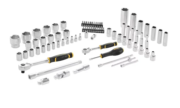 CONTENU : Jeu de clés à cliquet et de douilles avec accessoires 1/4 » et 1/2 »