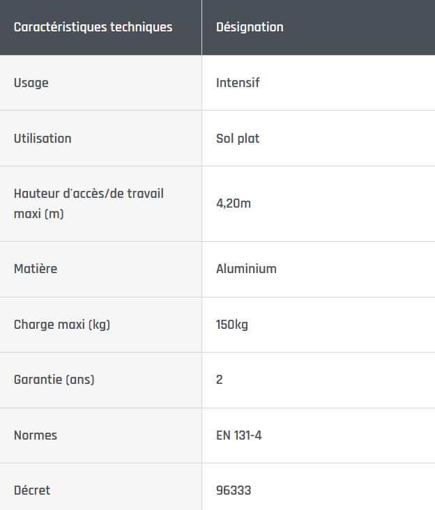 Cette échelle peut être utilisée dans 4 positions différentes : droite, plateau d’accès, double plan et position écarteur de mur. Elle est compacte et parfaite pour tout type d’artisan. Elle répond à la norme EN 131-4 et au décret français 96 333.