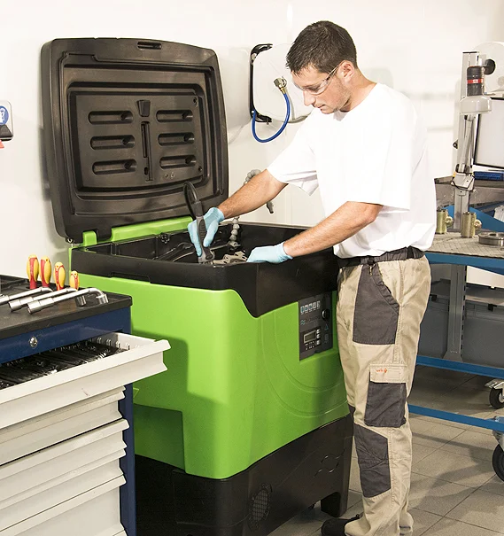 Le couvercle hermétique empêche le liquide de lavage de s’évaporer. La machine à laver a des roues pour pouvoir être déplacée à l’intérieur de l’atelier.