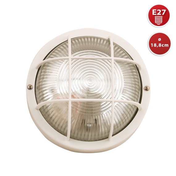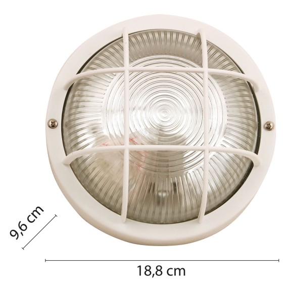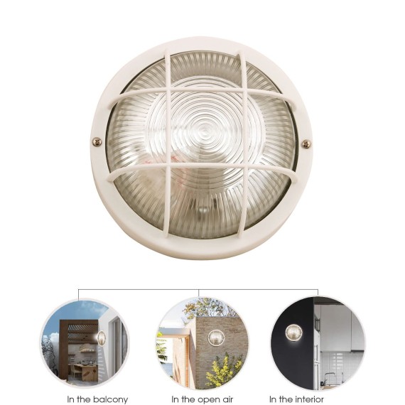 Design élégant : la lampe ronde E27 propose un design classique et simple. Facile à monter aussi bien au mur qu’au plafond. Étanche : la lampe est conçue pour une utilisation en intérieur et en extérieur grâce à son indice de protection IP44, étanche à l’eau et à la poussière. Idéal pour salle de bain, balcon, salon, couloir, atelier, garage, jardin etc. S’utilise avec n’importe quelle ampoule E27 (LED, à incandescence ou à économie d’énergie) 60 W max. Les matériaux sont de qualité : plastique et verre lourd. Chevilles fournies.