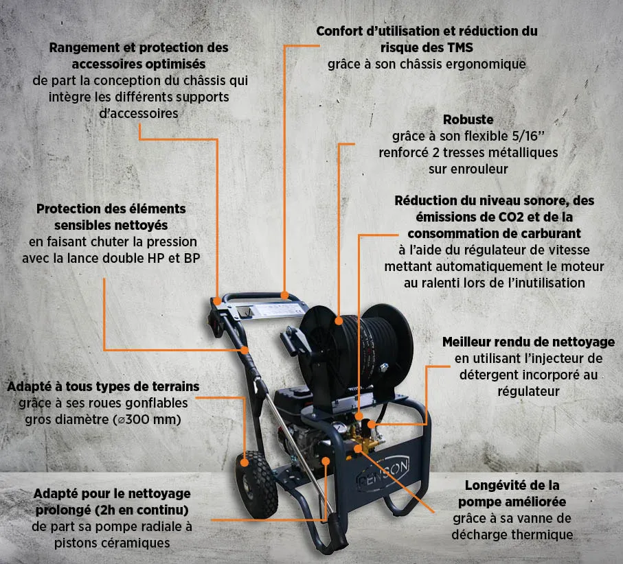 Les nettoyeurs haute pression RENSON avec enrouleur 20 m sont des appareils robustes et performants conçus pour un nettoyage efficace de surfaces extérieures. Ils offrent un débit d’eau de 10 L/min et une pression élevée (150 – 160 bar), ce qui permet de décoller facilement saletés, boue, graisse, mousses sur différentes surfaces (terrasses, façades, véhicules, engins, outils, etc.).