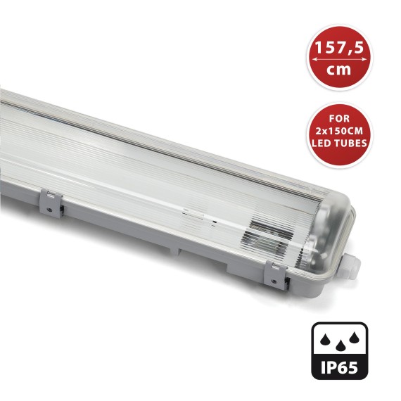 Plafonnier étanche à utiliser avec 2 tubes LED, format T8 de 150 cm; culot G13. Les tubes LED (non fournis) doivent être alimentés d’un seul côté. Base et clips en ABS; diffuseur en polycarbonate. Le tube LED peut être inséré de chaque côté. Puissance max. de chaque tube: 22W. Installable à l’extérieur et à l’intérieur; IP65: étanche aux éclaboussures; parfait pour garages, parkings, caves, plafonds, garages, locaux techniques.